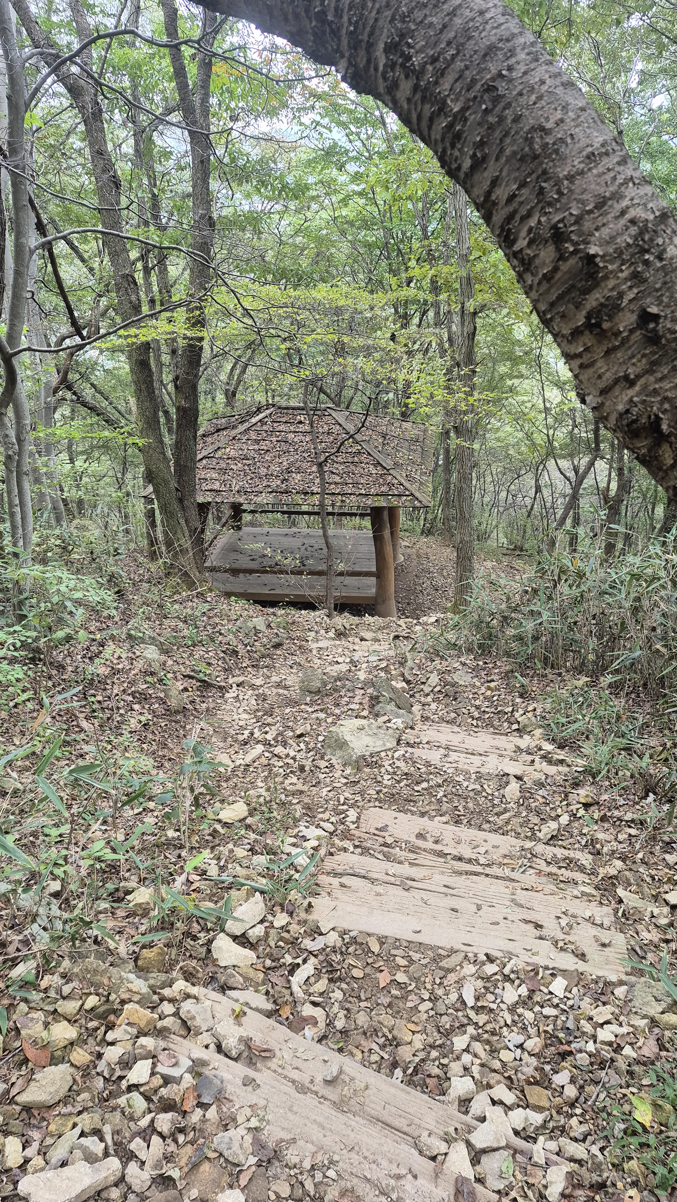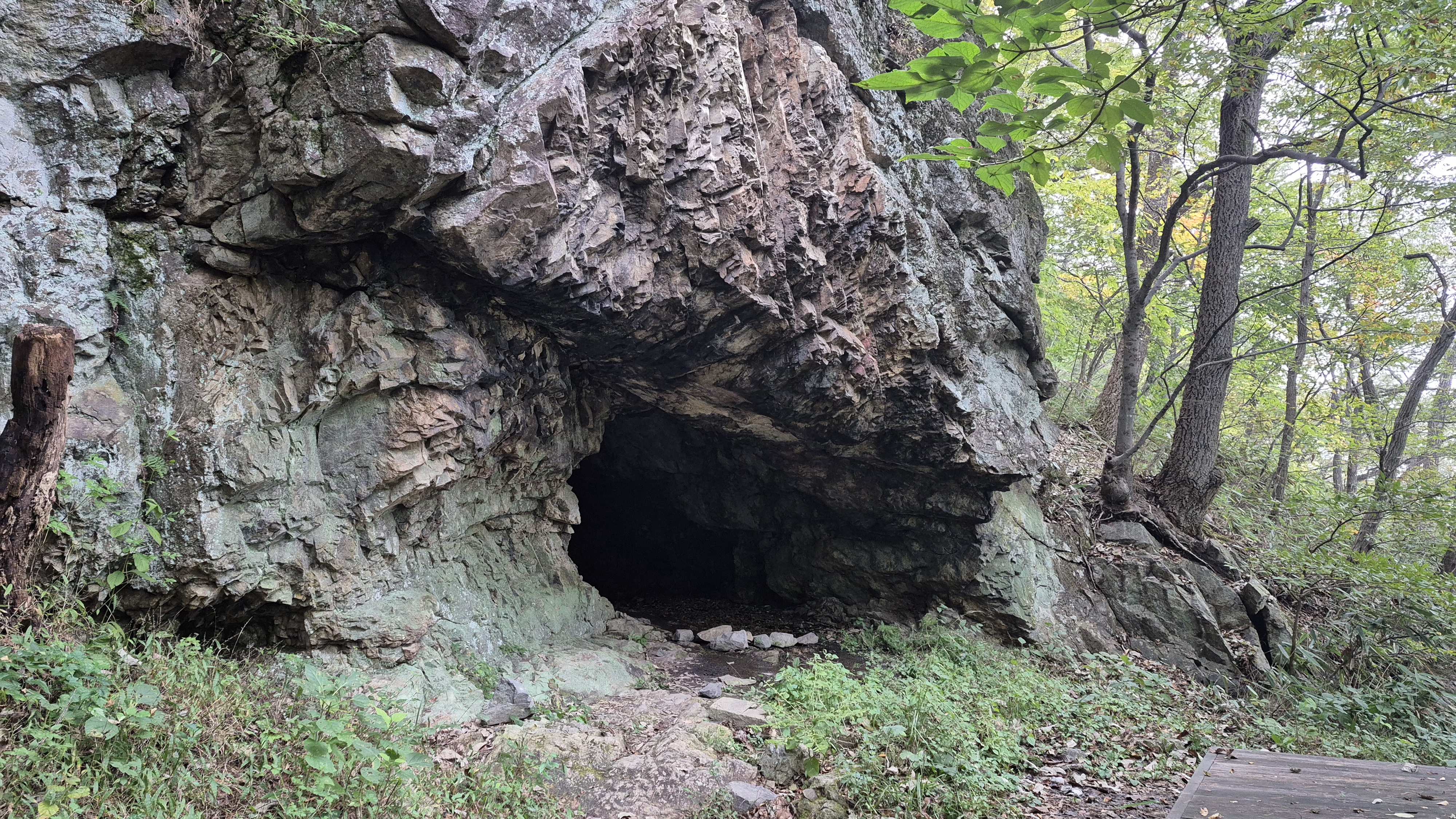 작은 동굴 앞에 데크 쉼터가 있습니다
